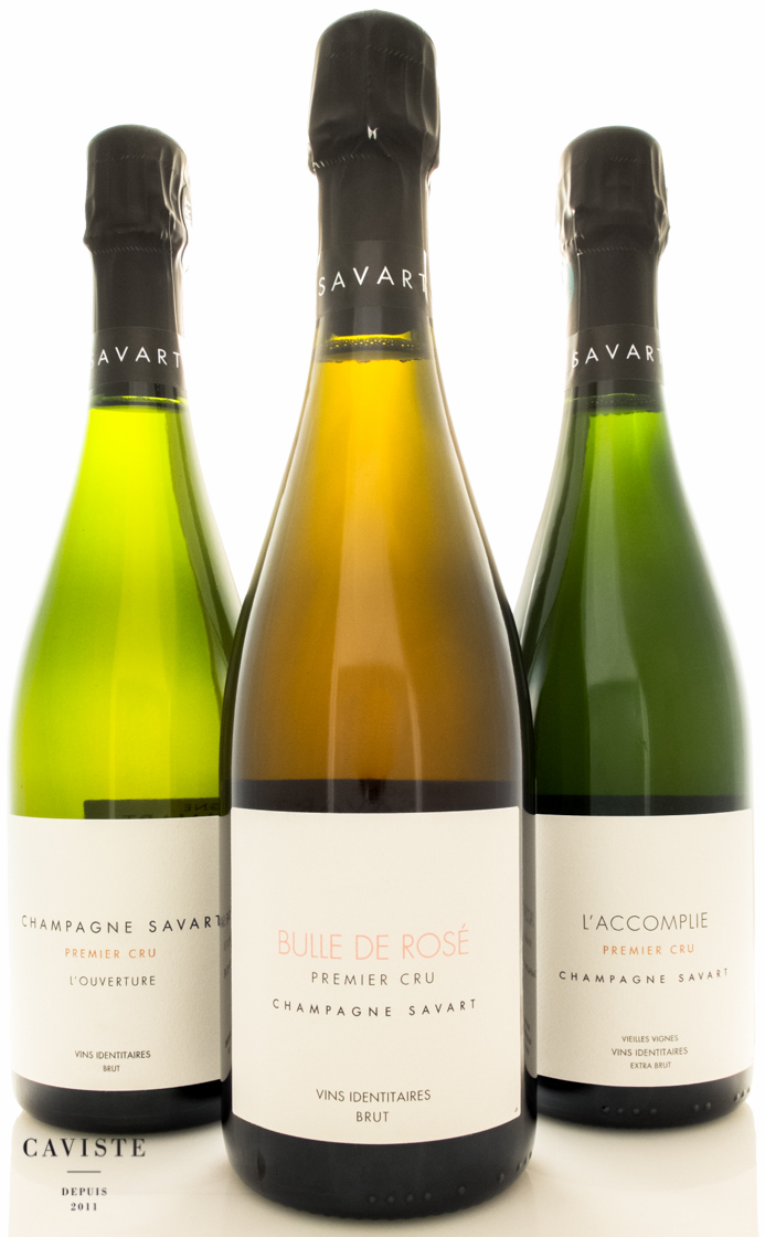 CAV0062 innehåller Frédérics tre årgångslösa viner, där man blandar vin från flera olika årgångar innan buteljering utan att skriva ut årgång på etiketten. Startpunkten i Savarts produktion heter Brut l’Ouverture (2 flaskor), ett vin gjort på enbart pinot noir-druvor från egendomens yngre vingårdar. Frédéric låter l’Ouverture, till skillnad från sina övriga viner, genomgå malolaktisk jäsning, en naturlig process där vinets äppelsyra omvandlas till mjukare mjölksyra. På nästa nivå hittar vi Extra Brut l’Accomplie (2 flaskor), som kommer från gamla stockar, mestadels pinot noir men Frédéric gillar att blanda med lite chardonnay för att öka friskheten. l’Accomplie är en blandning av vin från två årgångar (2014 & 2013) som tappats på flaska för kolsyrejäsning på våren 2015. Tack vare enastående kvalitet från båda årgångarna har Frédéric doserat denna upplaga av l’Accomplie med enbart 4,5 gram socker per liter. Brut Bulle de Rosé (2 flaskor) är Savarts roséchampagne. Vin från 2014 och 2013 har blandats med 5 % rött vin på pinot noir från 2014. Frédéric gör alltid det röda vinet från en liten isolerad vingård med gamla stockar i varmt mikroklimat på sluttningen i Écueil. Denna upplaga av Bulle de Rosé är tappad på flaska i mars 2015 och har fått ligga 18 månader på jästfällningen innan degorgering för att ge ett fruktigt och mineraliskt vin. Savarts viner har alltid en distinkt syra som gör att de passar utmärkt i sammanhang där plockmat eller tilltugg, gärna med markerad sälta, serveras. l’Ouverture är, tack vare sin lite mjukare karaktär, ett utmärkt val till apéritif, varför inte med rostade mandlar eller lättsaltade potatischips som tilltugg. I l’Accomplie får vi ett koncentrerat vin med balanserad syra som gärna ser en hemmagjord skagenröra på bordet. Bulle de Rosé fungerar utmärkt som aptitretande fördrink, gärna tillsammans med en bricka laxsnittar, men här finns även kraft för att matcha Homard thermidor. Savarts viner blir alltid bättre av att öppnas i god tid före servering så att de får luft och av att inte serveras för kalla.