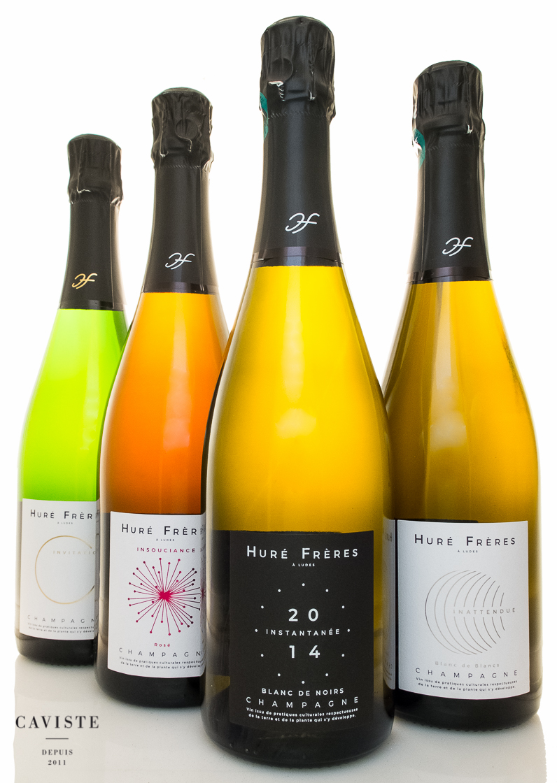 CAV0138 innehåller fyra av bröderna Hurés viner. Startpunkten är den årgångslösa Invitation (2 flaskor). Basen i denna utgåva är vin från 2017 som kompletterats med hela 50% reservvin. Reservvinet kommer från ett solerasystem som startats 1995 och som kontinuerligt fylls på med senaste årgången efter att man tappat av det man behöver till årets produktion. Med Invitation vill man skapa ett vin som är inbjudande, uppfriskande och okomplicerat och där druvsammansättningen speglar egendomens druvproportioner i vingårdarna (20% chardonnay/40% pinot noir/40% pinot meunier). Huré Frères roséchampagne heter Insouciance (2 flaskor), även denna utan årgång. Basvin från 2018 i kombination med lite kortare tid på jästfällningen ger ett fruktig och tillgänglig uttryck med mycket fin balans. Firmans Blanc de Blancs heter Inattendue (1 flaska), och är en årgångsbetecknad, ren chardonnay från tre karga sluttningar i Ludes och Rilly-la-Montagne. Årgång 2016 har gett en inbjudande och generös tolkning av chardonnay-druvan på norra sidan av Montage de Reims. Det andra årgångsvinet i CAV0138, Instantanée (1 flaska), är en blanc de noirs, gjord på endast blå druvor, från byarna Ludes och Rilly-la-Montagne. Hurés karaktäristiskt krispiga frukt och krämiga textur ger årgång 2014 av Instantanée läcker balans som klarar många års lagring. Stilen på Huré Frères champagner kännetecknas av balans och frisk fruktighet. Invitation serveras bäst som apéritif när man, precis som namnet antyder, har gäster inbjudna på middag. Roséchampagnen Insouciance går att använda på samma sätt som Invitation men den krispiga, ljusröda frukten gör att den också fungerar utmärkt till mat. Prova till snittar med lax eller skagenröra före maten eller varför inte till grillad hummer. Av de två årgångsvinerna väljer vi Inattendue till skaldjursfatet medan Instantanée med sin smakrikedom gärna får serveras till jordärtskockssoppa toppad med halstrad pilgrimsmussla. Huré Frères viner blir alltid bättre av att öppnas i god tid före servering och ska inte serveras för kalla.