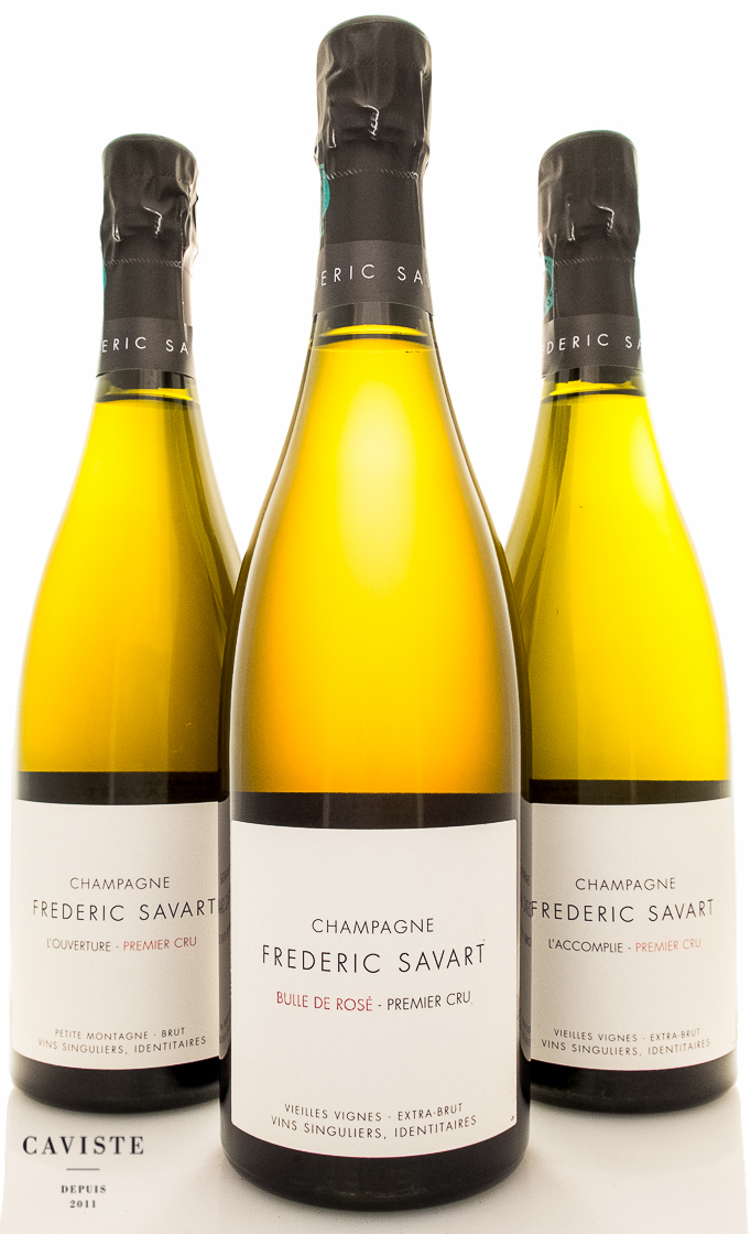 CAV0146 innehåller Frédérics tre årgångslösa viner, där man blandar vin från flera olika årgångar innan buteljering utan att skriva ut årgång på etiketten. Startpunkten i Savarts produktion heter l’Ouverture Premier Cru Brut (3 flaskor), ett vin gjort på enbart pinot noir-druvor från egendomens yngre vingårdar och ungefär en tredjedel vardera av årgångarna 2019, 2018 & 2017. Frédéric låter l’Ouverture, till skillnad från sina övriga viner, delvis genomgå malolaktisk jäsning, en naturlig process där vinets äppelsyra omvandlas till mjukare mjölksyra. På nästa nivå hittar vi ekfatsjästa l’Accomplie Premier Cru Extra-Brut (2 flaskor), som kommer från gamla stockar, mestadels pinot noir men Frédéric gillar att blanda med lite chardonnay för friskheten. l’Accomplie är en blandning av vin från två årgångar (2019 & 2018) som tappats på flaska för kolsyrejäsning så sent som på hösten 2020 och fått 15 månaders vila på jästfällningen innan degorgering. Bulle de Rosé Premier Cru Extra-Brut (1 flaska) är Savarts efterfrågade roséchampagne. Denna upplaga är gjord på vin från 2019 och 2018 där den rosa färgen kommer från cirka fem procent rött stilla vin på pinot noir från 2018. Frédéric gör alltid det röda vinet från en liten isolerad vingård som kallas Les Gillis. Gamla stockar i varmt mikroklimat på den södra delen av sluttningen i Écueil, på gränsen till grannbyn Chamery. Bulle de Rosé är tappad på flaska i oktober 2020 och har fått ligga 15 månader på jästfällningen innan degorgering. Savarts viner har alltid en distinkt syra som gör att de passar utmärkt i sammanhang där plockmat eller tilltugg, gärna med markerad sälta, serveras. l’Ouverture är, tack vare sin något mjukare karaktär, ett utmärkt val till apéritif, varför inte med rostade mandlar eller lättsaltade potatischips som tilltugg. I l’Accomplie får vi ett koncentrerat vin med balanserad syra som passar suveränt till havskräftor eller varför inte sushi. Bulle de Rosé fungerar fint som aptitretande fördrink eller till förrätten på smörstekt råraka med rejäl klick löjrom och övriga klassiska tillbehör. För Savarts viner rekommenderas alltid några månaders vila efter degorgering. Upplevelsen blir allra bäst när flaskan öppnas en stund innan servering.
